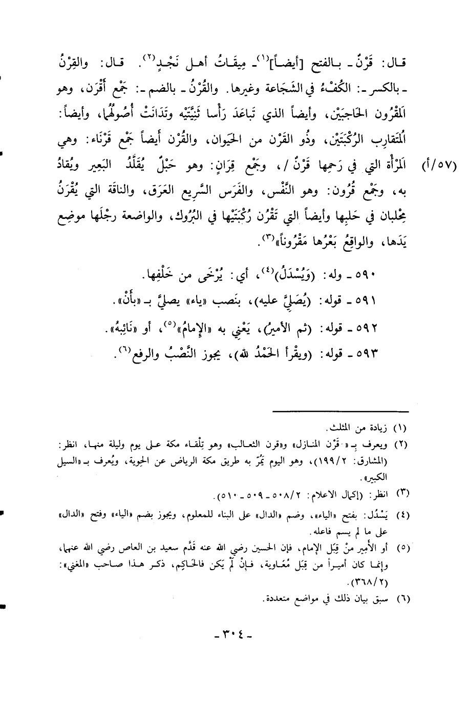قال: قَرْن - بالفتح [أيضاً] (¬1) - مِيقَاتُ أهل نَخدٍ (¬2). قال: والقِرْنُ -بالكسر-: الكُفْءُ في الشَجَاعة وغيرها. والقُرْنُ -بالضم-: جَمْع أَقْرَن، وهو الَمقْرُون الحَاجبَيْن، وأيضاً الذي تَباعَدَ رَأْسا ثَنِيَّتَيْه وتَدَانَتْ أُصُولُهُما، وأيضاً: الُمتَقارِب الرُكْبَتَيْن، وذُو القَرْن من الحيَوان، والقُرْن أيضاً جَمْع قَرْنَاء: وهي الَمرْأْة التي في رَحمِها قَرْنٌ، وجَمْع قِرَانٍ: وهو حَبْلٌ يُقَقدُ البَعِير وُيقادُ به، وجَمْع قُرُون: وهو النَّفْس، والفَرَس السَّرِيع العَرَق، والناقَة التي يُقْرَنُ مِحْلبان في حَلبِها وأيضاً التي تَقْرُن رُكْبَتَيْها في البُرُوك، والواضعة رجْلَها موضِع يَدَها، والواقِعُ بَعْرُها مَقْرُوناً" (¬3).