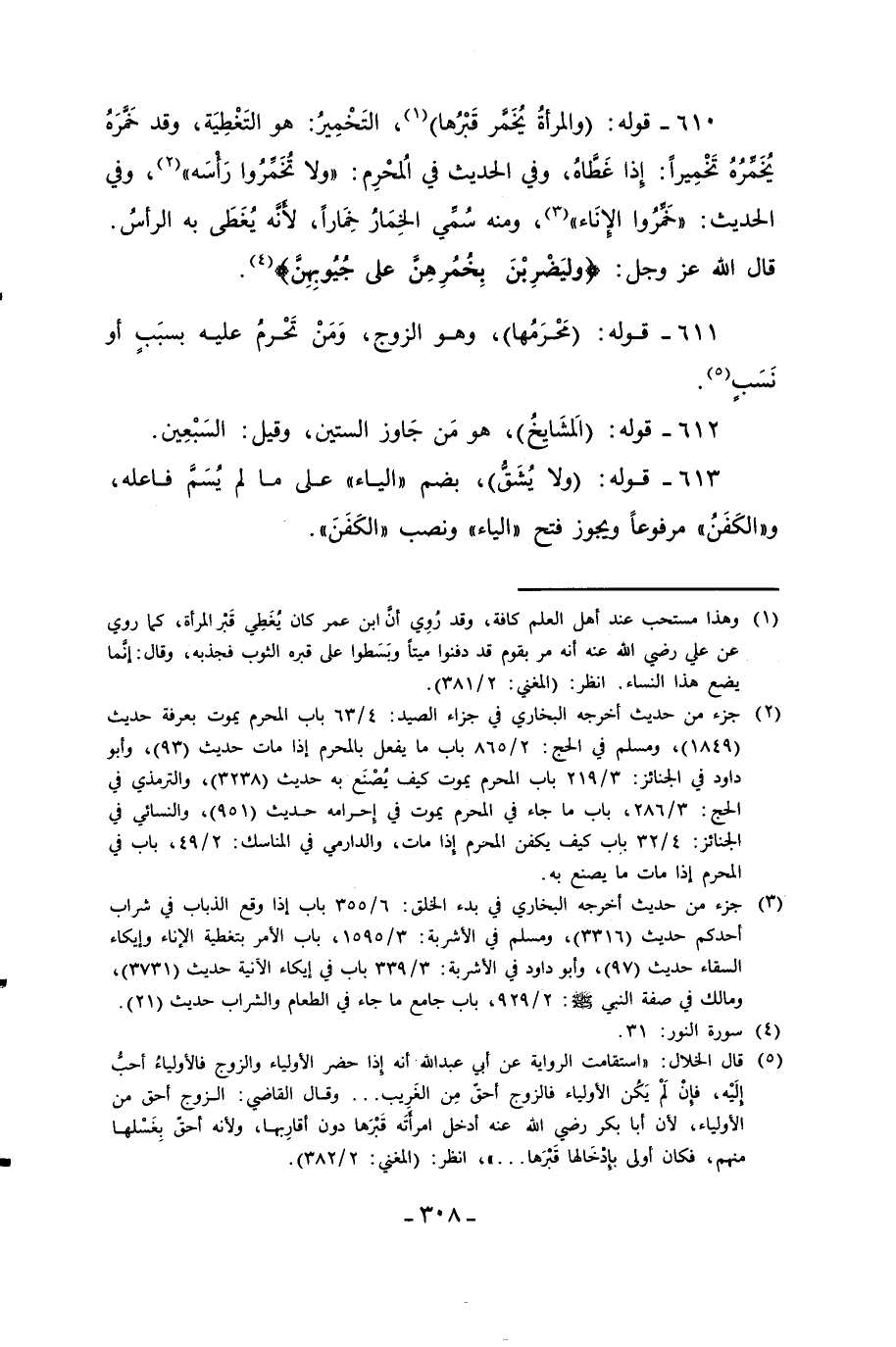 610 - قوله: (والمرأةُ يُخَمَّر قَبْرُها) (¬1)، التَخْمِيرُ: هو التَغْطِيَة، وقد خَمَّرَهُ يُخَمَّرُهُ تَخْمِيراً: إذا غَطَّاهُ، وفي الحديث في الُمحْرِم: "ولا تُخَمِّرُوا رَأْسَه" (¬2)، وفي الحديث: "خَمِّرُوا الإِنَاء" (¬3)، ومنه سُمِّي الخِمَارُ خِمَاراً، لأَنَّه يُغَطَى به الرأسُ. قال الله عز وجل: {وَلْيَضْرِبْنَ بِخُمُرِهِنَّ عَلَى جُيُوبِهِنَّ} (¬4).
