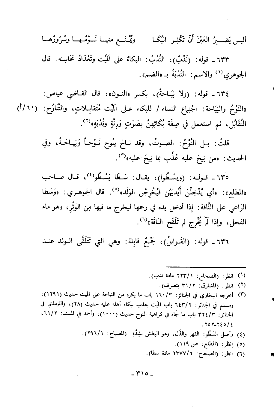 633 - قوله: (نَدْبٌ)، النَّدْبُ: البكاءُ على الَميت وتَعْدَادُ مَحَاسِنه. قال الجوهري (¬1) والاسم: النُدْبَةُ بـ "الضم".