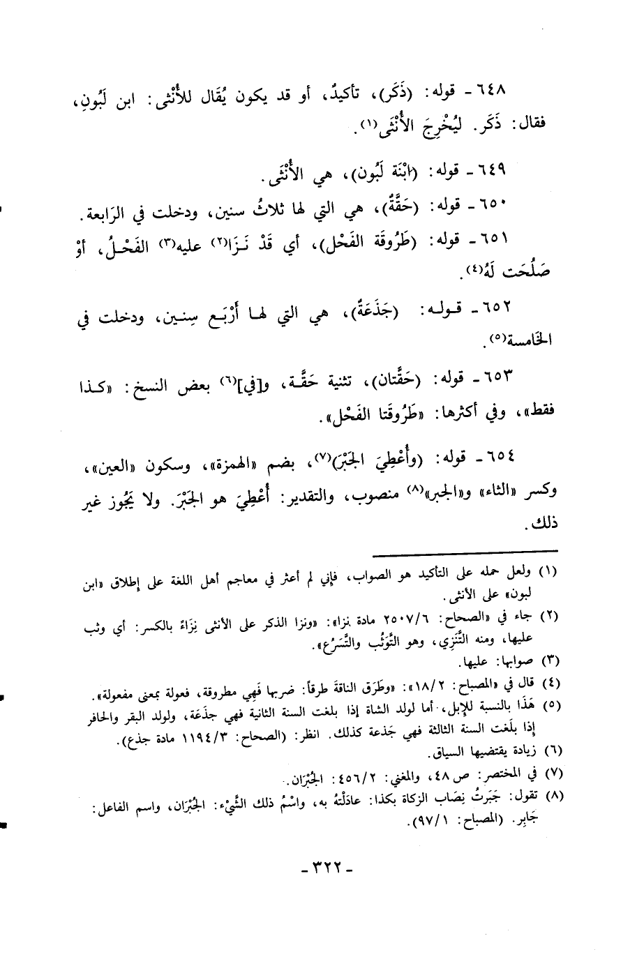 (¬5) هَذَا بالنسبة للإبل، أما لولد الشاة إذا بلغت السنة الثانية فهي جذَعَة، ولولد البقر والحافر إذا بلَغت السنة الثالثة فهي جَذعة كذلك. انظر: (الصحاح: 3/ 1194 مادة جذع).
