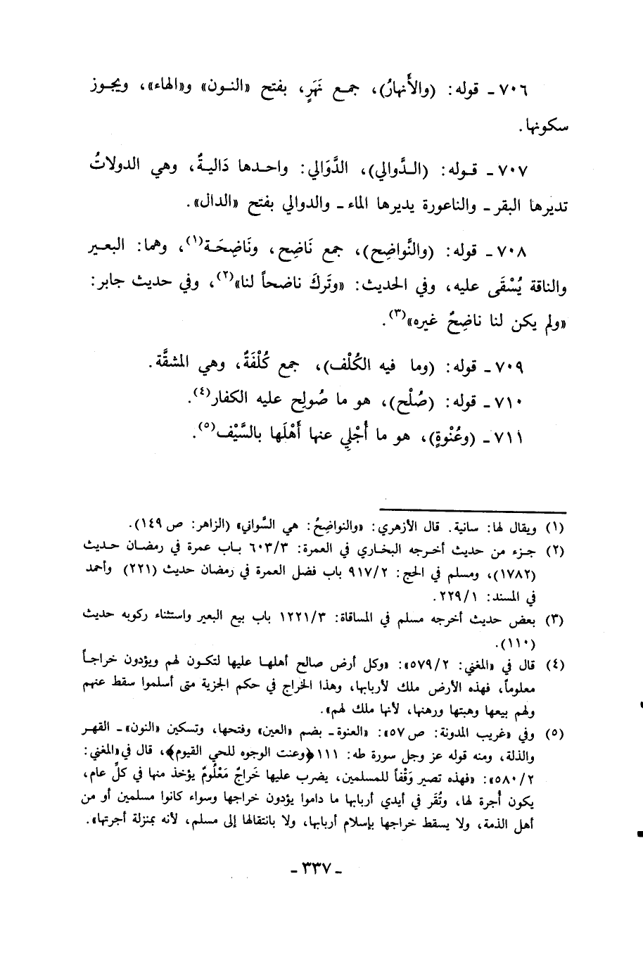 708 - قوله: (والنواضِح)، جمع نَاضِح، ونَاضحَة (¬1)، وهما: البعير والناقة يُسْقَى عليه، وفي الحديث: "وتَركَ ناضحاً لنا" (¬2)، وفي حديث جابر: "ولم يكن لنا ناضِحٌ غيره" (¬3).