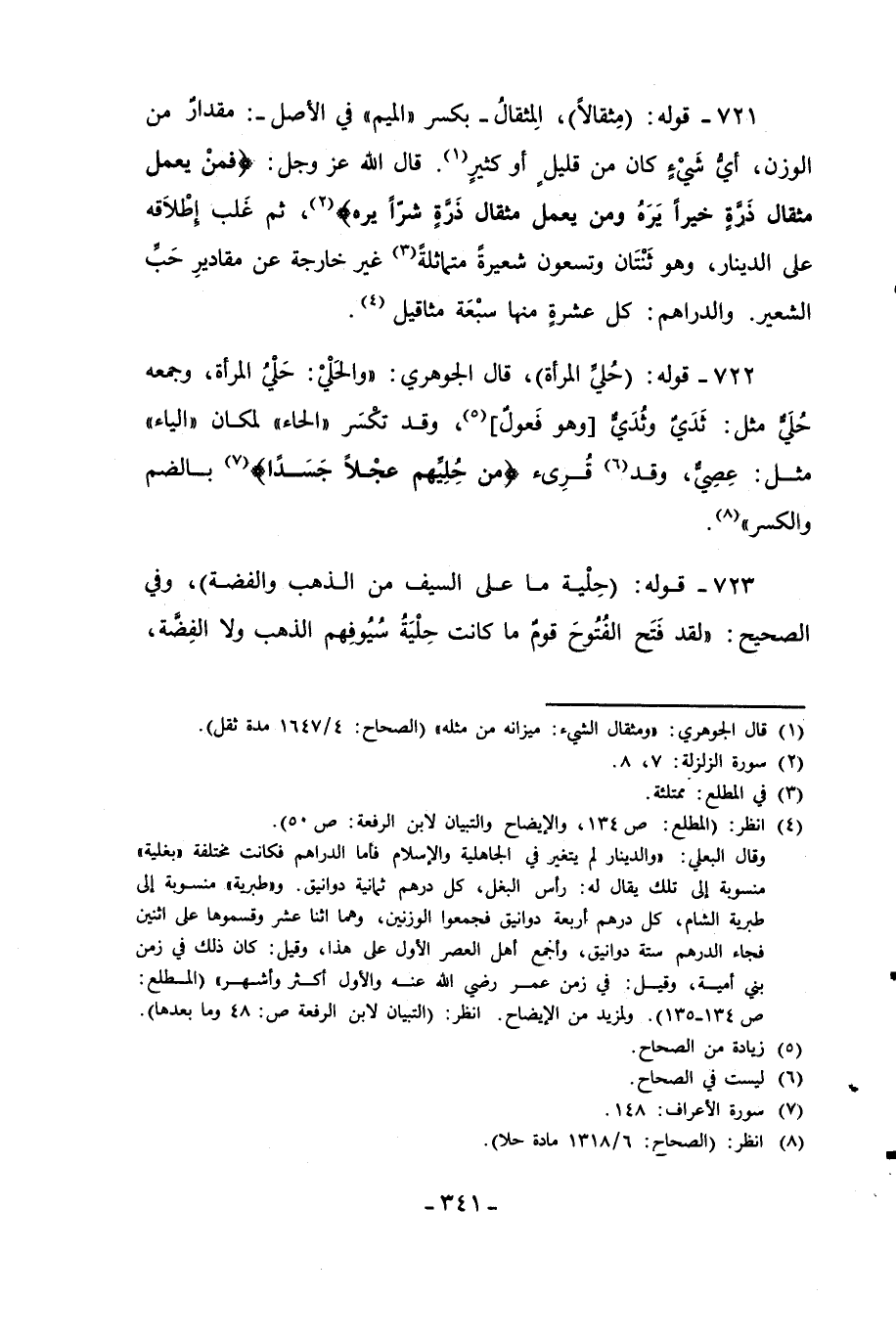 721 - قوله: (مِثقالاً)، الِمثقالُ -بكسر "الميم" في الأصل -: مقدارٌ من الوزن، أني شَيءٍ كان من قليل أو كثيرٍ (¬1). قال الله عَزَّ وَجَلَّ: {فَمَنْ يَعْمَلْ مِثْقَالَ ذَرَّةٍ خَيْرًا يَرَهُ (7) وَمَنْ يَعْمَلْ مِثْقَالَ ذَرَّةٍ شَرًّا يَرَهُ} (¬2)، ثم غَلب إطْلاَقه على الدينار، وهو ثَنْتَان وتسعون شعيرة متماثلةً (¬3) غير خارجة عن مقاديرِ حَبَّ الشعير. والدراهم: كل عشرةٍ منها سبْعَة مثاقيل (¬4).