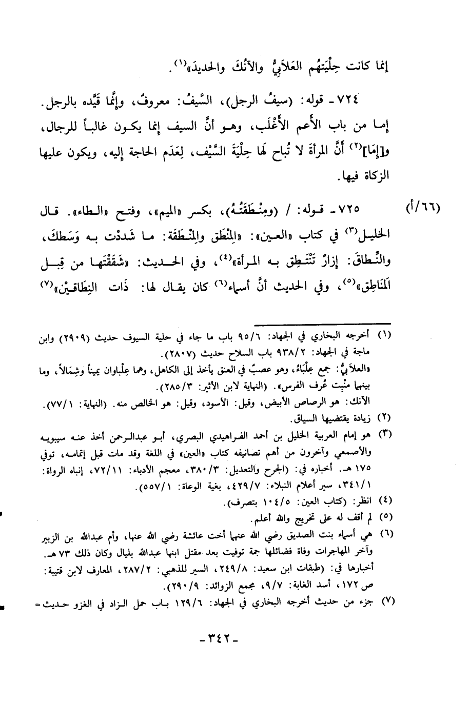 724 - قوله: (سيفُ الرجل)، السيفُ: معروف، وإنَّما قَيده بالرجل. إما من باب الأعم الأغْلَب، وهو أن السيف إِنما يكون غالبًا للرجال، و [إمَا] (¬2) أنَّ المرأةَ لا تُباح لها حِلْيَةَ السَّيْف، لِعَدَم الحاجة إليه، ويكون عليها الزكاة فيها.
