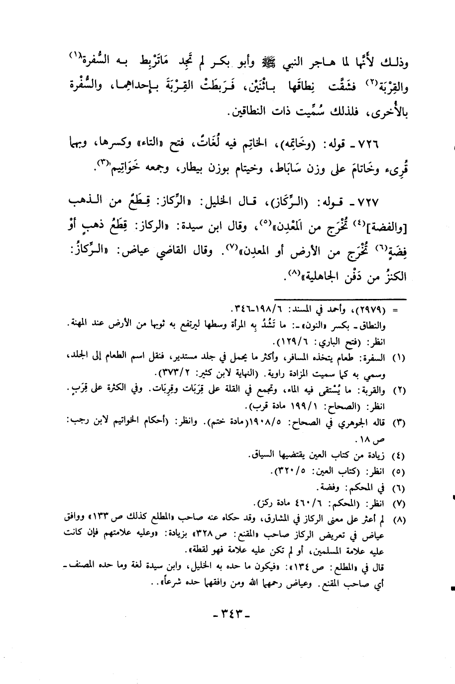 727 - قوله: (الرِّكَاز)، قال الخليل: (الركاز: قِطَعْ من الذهب [والفضة] (¬4) تُخْرَج من الَمعْدِن" (¬5)، وقال ابن سيدةْ "الركاز: قِطَعُ ذهبٍ أوْ فِضَةٍ (¬6) تُخْرَج من الأرض أو المعدِن" (¬7). وقال القاضي عياض: "الرِّكازُ: الكنز من دَفْن الجاهلية" (¬8).