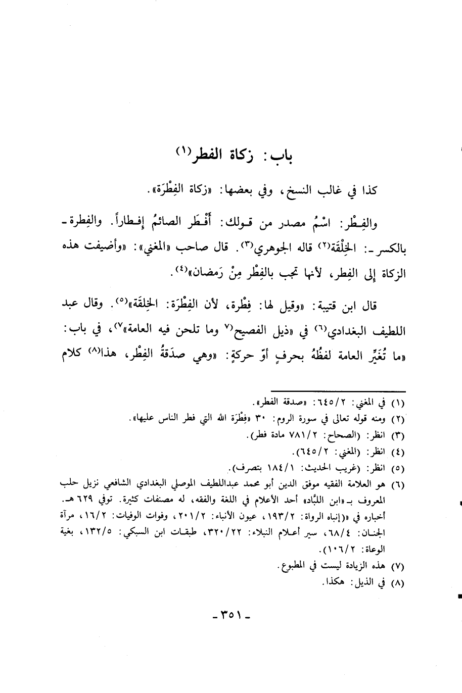 قال ابن قتيبة: "وقيل لها: فِطْرة؛ لأن الفِطْرَة: الخِلقَة" (¬5). وقال عبد اللطيف البغدادي (¬6) في "ذيل الفصيح (7 وما تلحن فيه العامة" (¬7)، في باب: "ما تُغَيِّر العامة لفظُهُ بحرفٍ أوّ حركةٍ: "وهي صدَقة الفِطْر، هذا (¬8) كلام