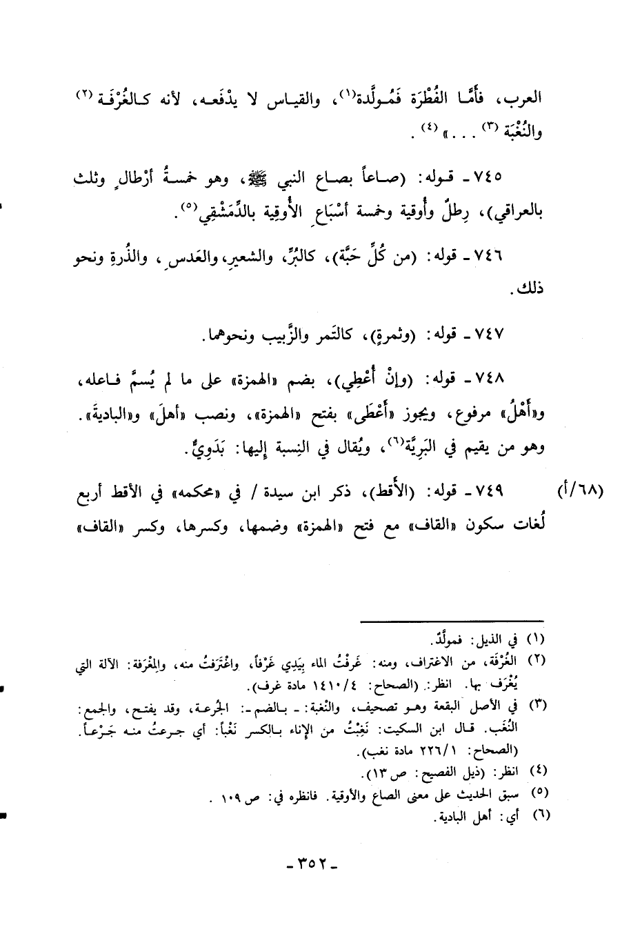 745 - قوله: (صاعًا بصاع النبي - صلى الله عليه وسلم -، وهو خمسة أرْطالٍ وثلث بالعراقي)، رِطلٌ وأوقية وخسة أسْبَاعِ الأوقِية بالدِّمَشْقِي (¬5).
