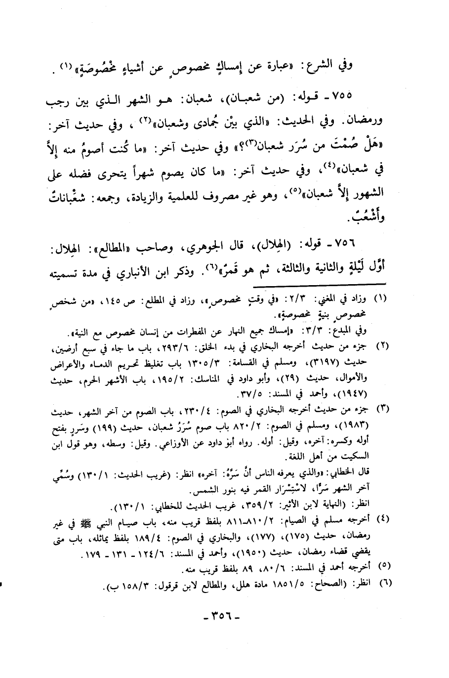 755 - قوله: (من شعبان)، شعبان: هو الشهر الذي بين رجب ورمضان. وفي الحديث: "الذي بيْن جُمادى وشعبان" (¬2)، وفي حديث آخر: "هَلْ صُمْتَ من سُرَر شعبان (¬3)؟ " وفي حديث آخر: "ما كُنت أصومُ منه إلا في شعبان" (¬4)، وفي حديث آخر: "ما كان يصوم شهرًا يتحرى فضله على المشهور إلَّا شعبان" (¬5)، وهو غير مصروف للعلمية والزيادة، وجمعه: شعباناتٌ وأشْعُبٌ.