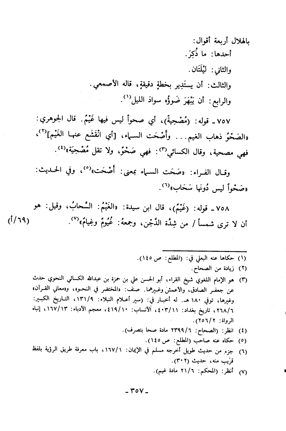 757 - قوله: (مُصْحِيةً)، أي صحوًا ليس فيها غَيْمٌ. قال الجوهري: "الصَحْوُ ذهاب الغيم ... وأصْحَت السماء، [أي انْقَشَع عنها الغَيْم] (¬2)، فهي مصحية، وقال الكسائي (¬3): فهي صَحْوٌ، ولا تقل مُصْحِية" (¬4).