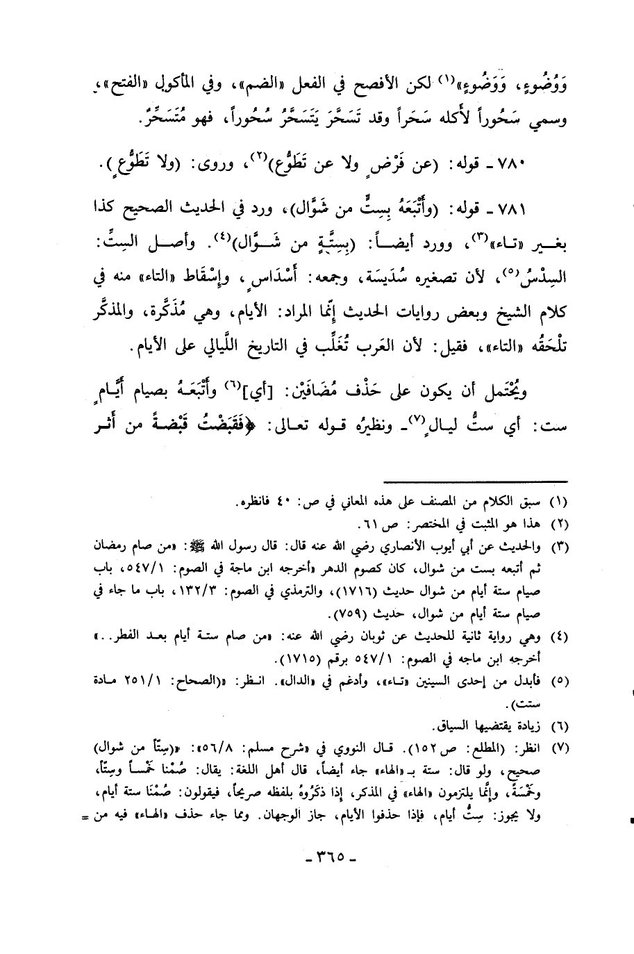 781 - قوله: (وأتبَعَة بِسِتٍّ من شَوال)، ورد في الحديث الصحيح كذا بغير "تاء" (¬3)، وورد أيضًا: (بِسِتَّةٍ من شَوال) (¬4). وأصل السِتِّ: السِدْسُ (¬5)؛ لأن تصغيره سدَيسَة، وجمعه: أسْدَاسٍ، وإِسْقَاط "التاء" منه في كلام الشيخ وبعض روايات الحديث إِنّما المراد: الأيام، وهي مُذَكَرة، والمذكَّر تلْحَقُه "التاء"، فقيل: لأن العَرب تُغَلّب في التاريخ اللَّيالي على الأيام.
