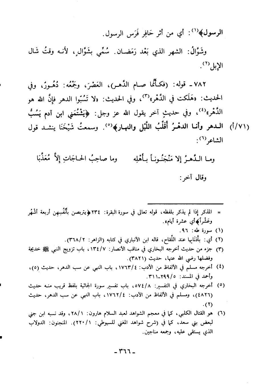 782 - قوله: (فكأنَّما صام الدَّهر)، العَصْرَ، وجَمْعُه: دُهُورٌ، وفي الحديث: "هَلَكت في الدَّهْر" (¬3)، وفي الحديث: "لا تَسُبوا الدهر فإِنَّ الله هو الدَّهْر" (¬4)، وفي حديثٍ آخر يقول الله عز وجل: "يَشْتُمَني ابن آدم يَسُبُّ الدهر وأنا الدهْرُ أُقَلِّبُ اللَّيْل والنهار" (¬5). وسمعتُ شَيْخَنَا ينشد قول الشاعر (¬6):
