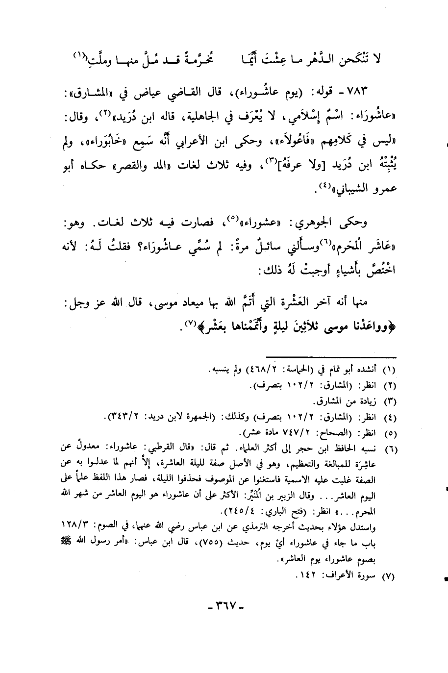 783 - قوله: (يوم عاشوراء)، قال القاضي عياض في "المشارق": "عاشُورَاء: اسْم إِسْلاَمي، لا يُعْرَف في الجاهلية، قاله ابن دُرَيد" (¬2)، وقال: "ليس في كَلامِهم "فَاعُولاَء"، وحكى ابن الأعرابي إنّه سَمِع "خَابُوَراء"، ولم يُثْبِتْهُ ابن دُرَيد [ولا عرفَهُ] (¬3)، وفيه ثلاث لغات "المسند والقصر" حكاه أبو عمرو الشيباني" (¬4).