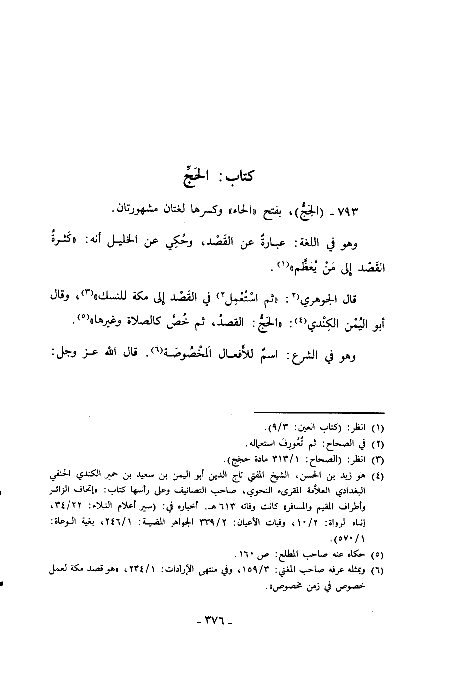(¬6) وبمثله عرفه صاحب المغني: 3/ 159، وفي منتهى الإرادات: 1/ 234، "هو قصد مكة لعمل خصوص في زمن مخصوص".