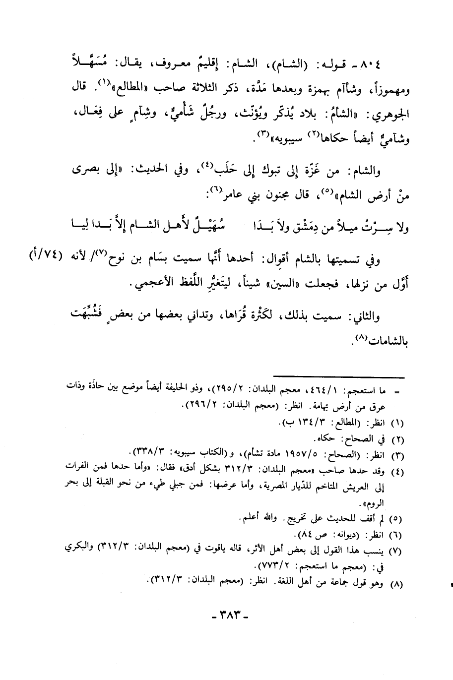 804 - قوله: (الشام)، الشام: إقليمٌ معروف، يقال: مُسَهَّلاً ومهموزًا، وشأآم بهمزة وبعدها مَدَّة، ذكر الثلاثة صاحب "المطالع" (¬1). قال الجوهري: "الشأمُ: بلاد يُذكّر وُيؤنّث، ورجُلٌ شَأْميٌّ، وشِآمٍ على فِعَال، وشآميٌّ أيضاً حكاها (¬2) سيبويه" (¬3).