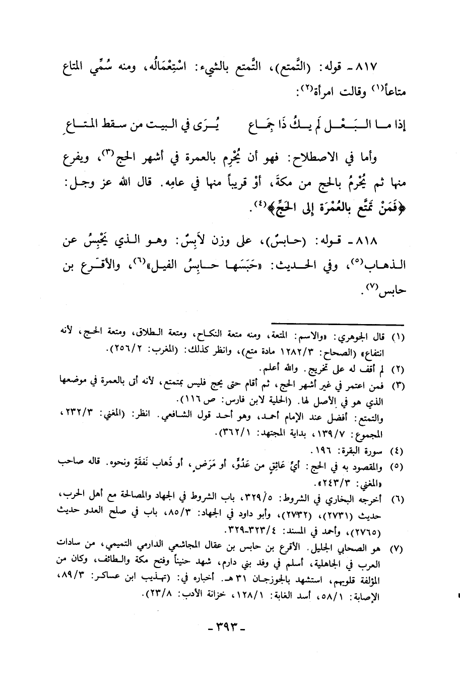 817 - قوله: (التَّمتع)، التَّمتع بالشيء: اسْتِعْمَالُه، ومنه سُمِّي المتاع متاعاً (¬1) وقالت امرأة (¬2):