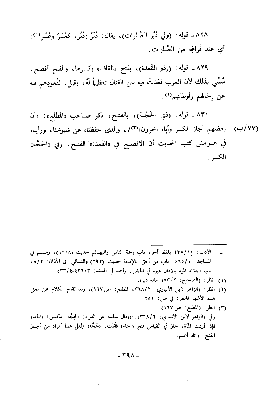 830 - قوله: (ذي الحَجَّة)، بالفتح، ذكر صاحب "المطلع": "أن بعضهم أجاز الكسر وأباه آخرون" (¬3)، والذي حفظناه عن شيوخنا، ورأيناه في هوامش كتب الحديث أن الأفصح في "القَعدة" الفتح، وفي "الحِجَّة" الكسر.