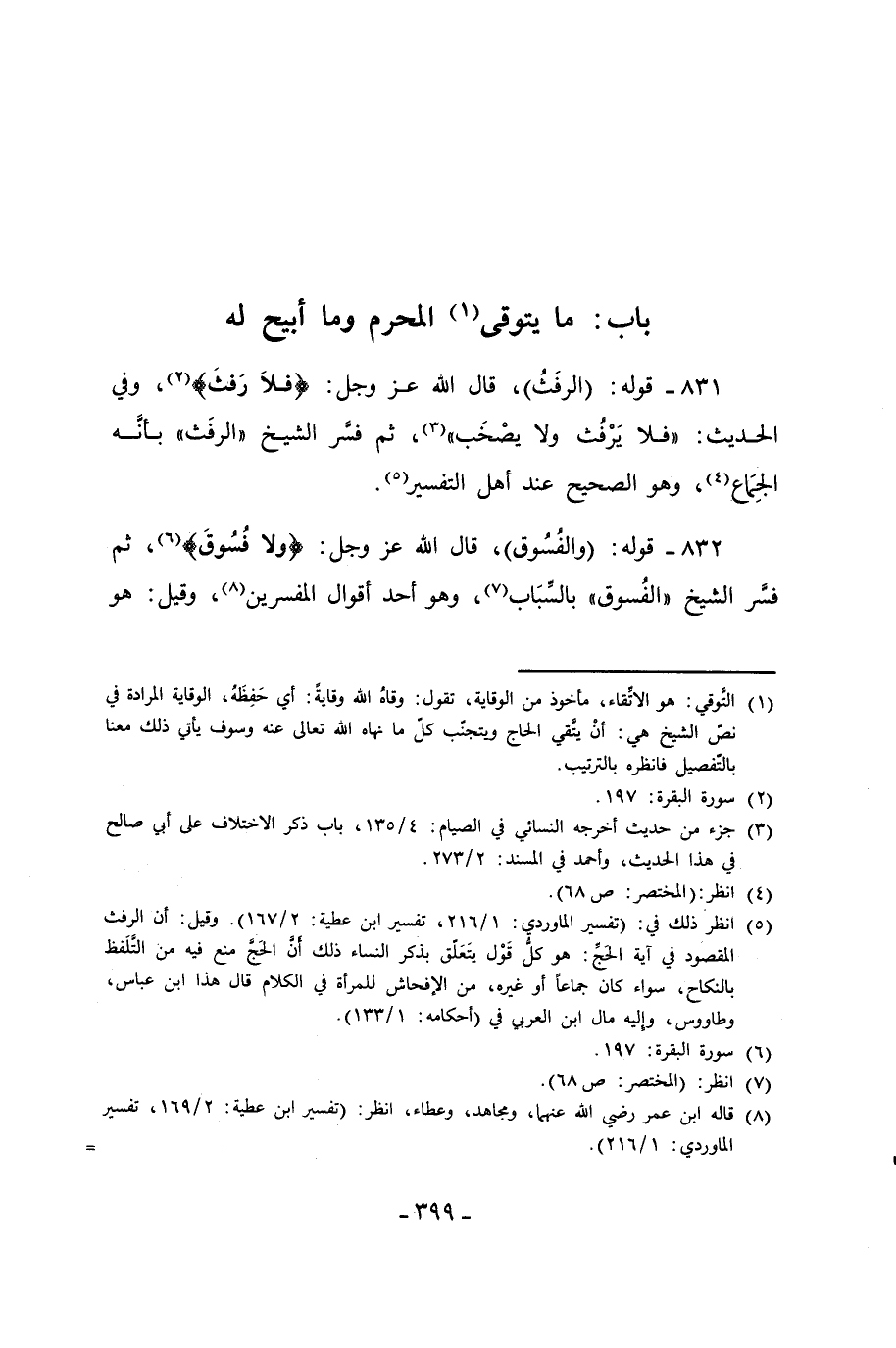 832 - قوله: (والفسُوق)، قال الله عز وجل: {وَلَا فُسُوقَ} (¬6)، ثم فسَّر الشيخ "الفُسوق" بالسِّبَاب (¬7)، وهو أحد أقوال المفسرين (¬8)، وقيل: هو