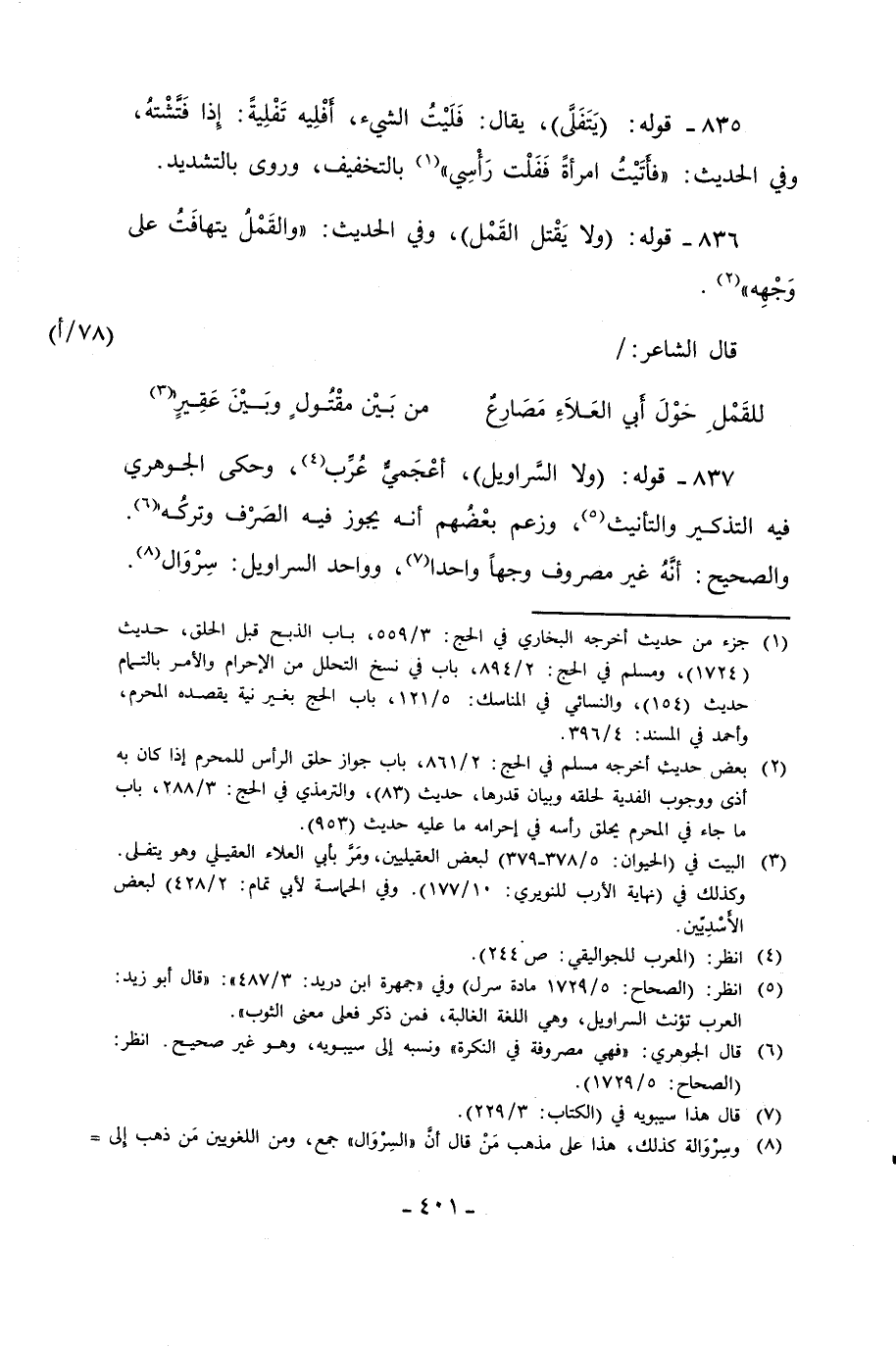 (¬5) انظر: (الصحاح: 5/ 1729 مادة سرل) وفي "جمهرة ابن دريد: 3/ 487 ": "قال أبو زيد: العرب تؤنث السراويل، وهي اللغة الغالبة، فمن ذكر فعلى معنى الثوب".