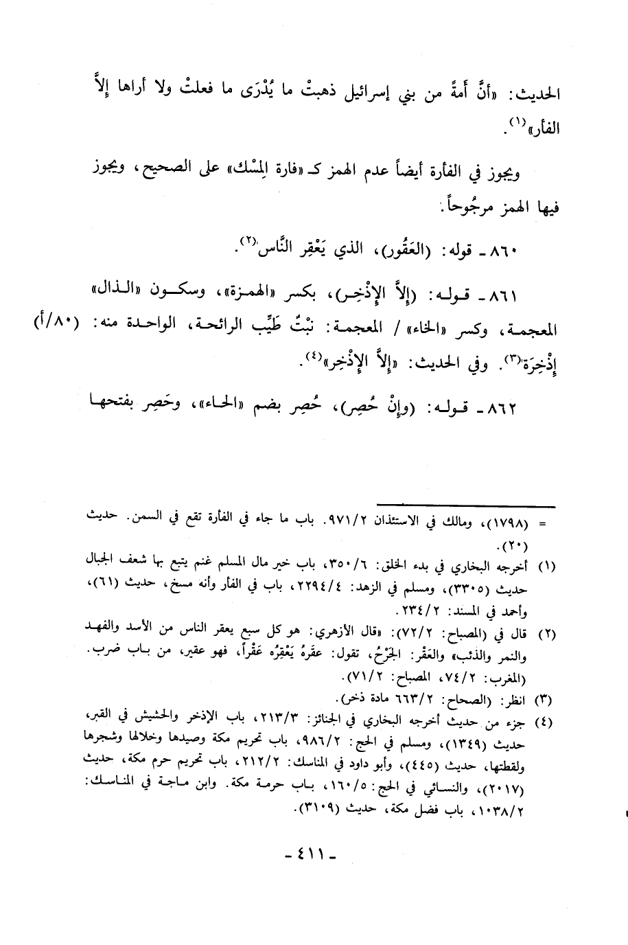 (¬4) جزء من حديث أخرجه البخاري في الجنائز: 3/ 213، باب الإذخر والحشيش في القبر، حديث (1349)، ومسلم في الحج: 2/ 986، باب تحريم مكة وصيدها وخلالها وشجرها ولقطتها، حديث (445)، وأبو داود في المناسك: 2/ 212، باب تحريم حرم مكة، حديث (2017)، والنسائي في الحج: 5/ 160، باب حرمة مكة. وابن ماجة في المناسك: 2/ 1038، باب فضل مكة، حديث (3109).