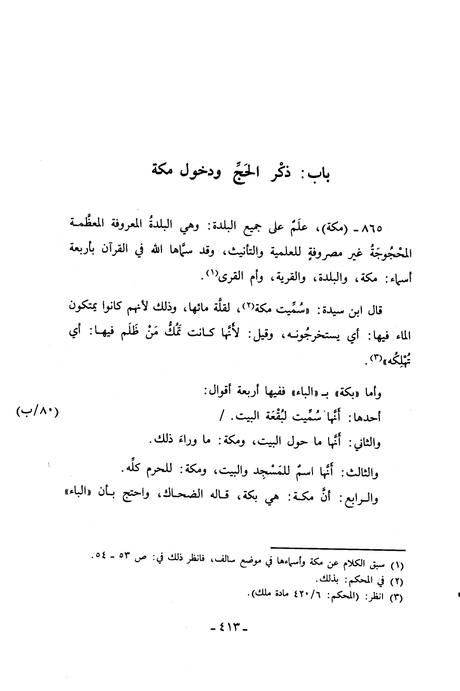 865 - (مكة)، علَم على جميع البلدة: وهى البلدةُ المعروفة المعظَّمة المحْجُوجَةُ غير مصروفةٍ للعلمية والتانيث، وقد سمَّاها الله في القرآن بأربعة أسماء: مكة، والبلدة، والقرية، وأم القرى (¬1).