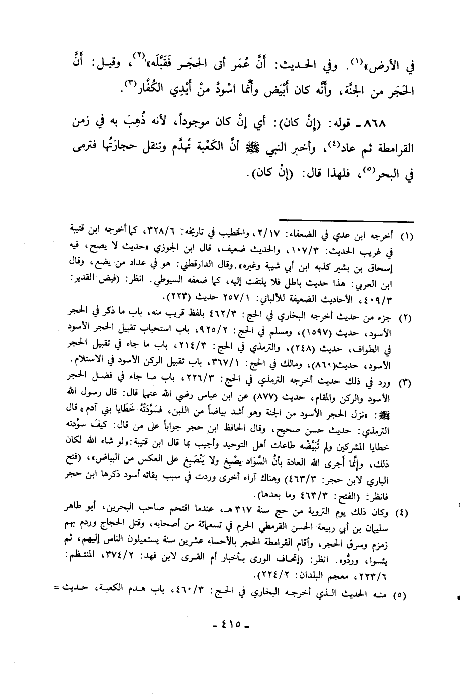 868 - قوله: (إنْ كان): أي إنْ كان موجوداً، لأنه ذُهِبَ به في زمن القرامطة ثم عاد (¬4) , وأخبر النبي - صلى الله عليه وسلم - أنَّ الكَعْبة تُهدَّم وتنقل حجارَتُها فترمى في البحر (¬5)، فلهذا قال: (إنْ كان).