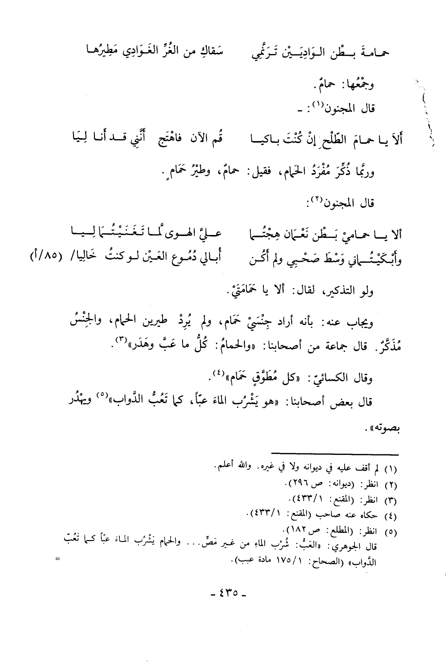 ويجاب عنه: بأنه أراد جِنْسَيْ حَمَام، ولم يُرِدْ طيرين الحمام، والجِنْسُ مُذَكَّرٌ. قال جماعة من أصحابنا: "والحمامُ: كُلُّ ما عَبَّ وهَدَر" (¬3).