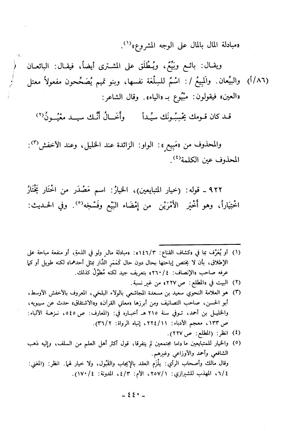 922 - قوله: (خيار المتبايعين)، الخيارُ: اسم مَصْدَر من اخْتَار يَخْتَارُ اخْتِيَاراً، وهو أخْيَر الأَمْرَيْن من إِمْضَاء البَيْع وفَسْخِه (¬5). وفي الحديث: