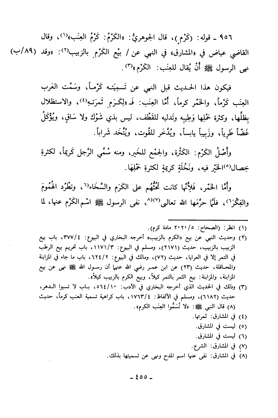 1956 - قوله: (كَرْمٍ)، قال الجوهريُّ: "الكَرْمُ: كَرْمُ العِنَب" (¬1)، وقال القاضي عياض في "المشارَق" في النهي عن بيْع الكَرْمِ بالزبيب (¬2): "وقد نهى الرسول - صلى الله عليه وسلم - أنْ يُقال للعِنَب: الكَرْم" (¬3).