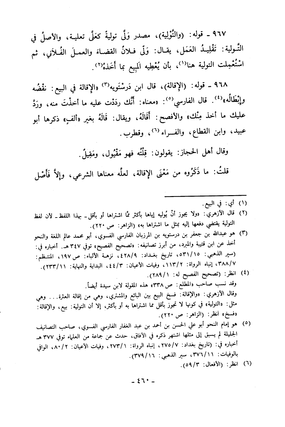 968 - قوله: (الِإقالة)، قال ابن دَرسْتَويه (¬3) "الِإقالة في البيع: نقْضُه وإبْطَالُه" (¬4). قال الفارسي (¬5): "معناه: أَنَّك ردَدْت عليه ما أخذْتَ منه، ورَدَّ عليك ما أخذ مِنْك" والأفصح: أقَالَهُ، ويقال: قَالَهُ بغير "ألفٍ" ذكرها أبو عبيد، وابن القطاع، والفراء (¬6)، وقطرب.