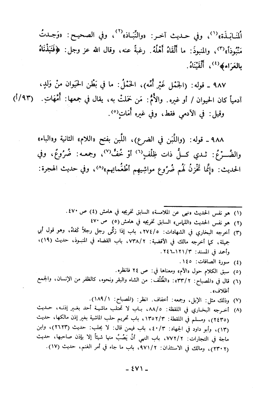 988 - قوله: (واللَّبَن في الضرع)، اللَّبن بفتح "اللام" الثانية و"الباء" والضَّرْعُ: ثدي كلُّ ذات ظِلْفٍ (¬6) أوْ خُفًّ (¬7)، وجمعه: ضرُوعٌ، وفي الحديث: "إِنَّما تَخْزنُ لَهم ضُرُوع مواشيهِم أطْعُماتِهم" (¬8)، وفي حديث الهجرة:
