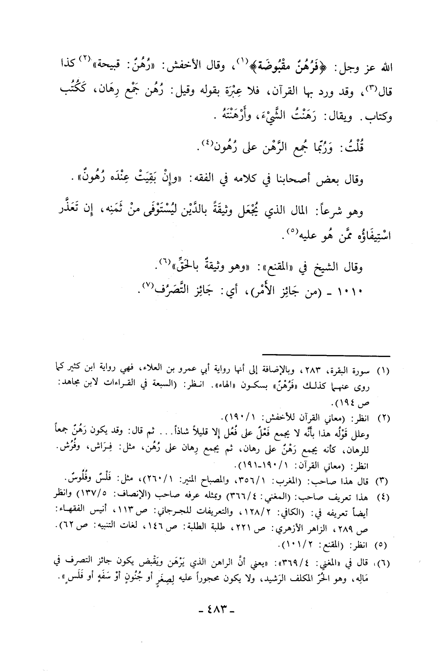 (¬6) قال في "المغني: 4/ 369 ": "يعني أنَّ الراهن الذي يَرْهَن ويَقْبض يكون جائز التصرف في مَالِه، وهو الحُرّ المكلف الرَشيد، ولا يكون محجوراً عليه لِصغَرٍ أو جُنُونٍ أوْ سَفَهٍ أو فَلَسٍ".
