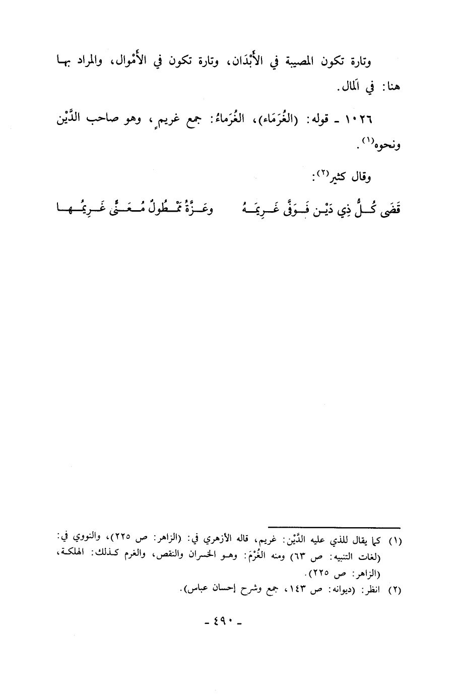 (¬1) كما يقال للذي عليه الدَّيْن: غريم، قاله الأزهري في: (الزاهر: ص 225)، والنووي في: (لغات التنبيه: ص 63) ومنه الغُرْمَ: وهو الخسران والنقص، والغرم كذلك: الهلكة، (الزاهر: ص 225).