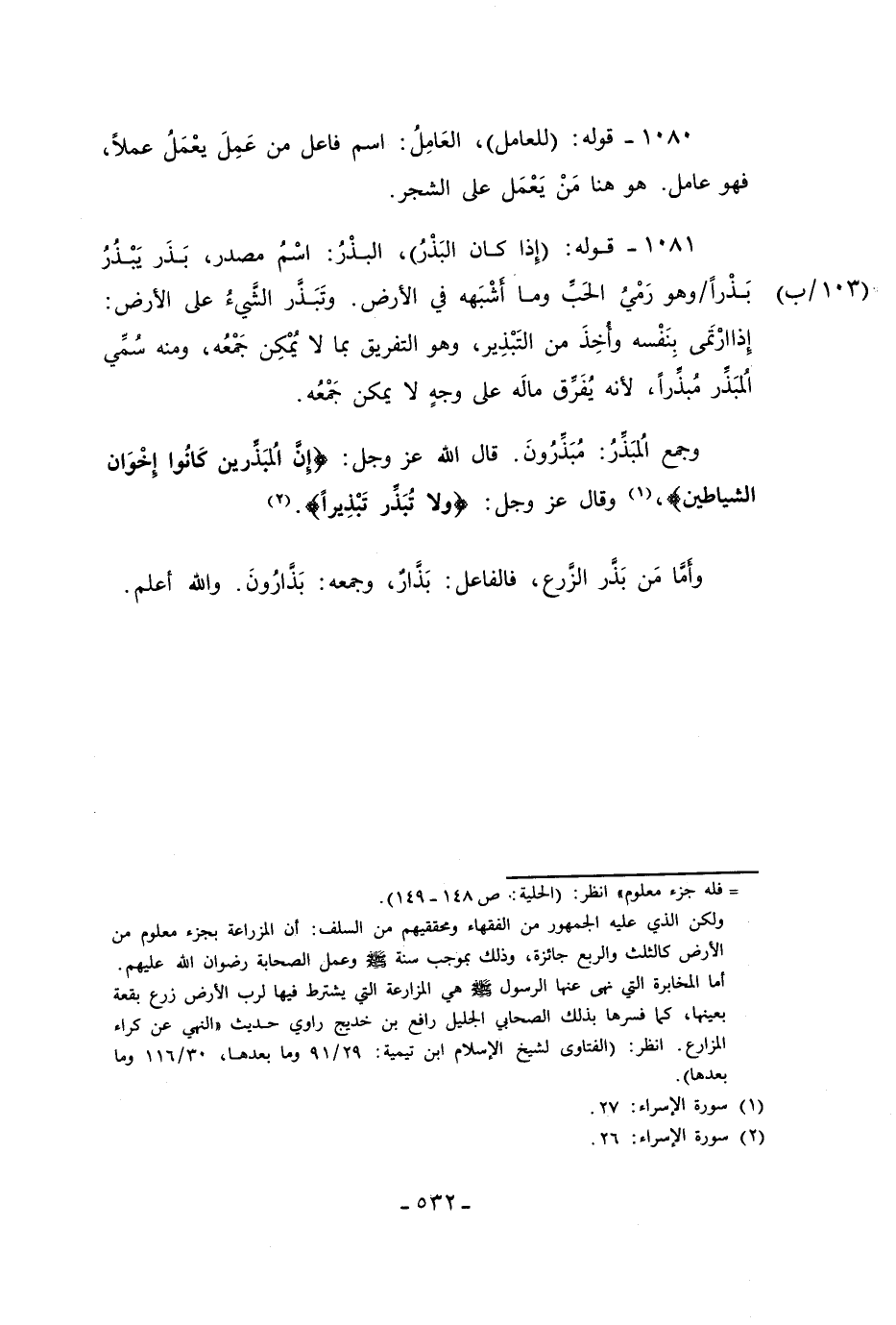 وجمع المبَذِّر: مبَذِّرونَ. قال الله عز وجل: {إِنَّ الْمُبَذِّرِينَ كَانُوا إِخْوَانَ الشَّيَاطِينِ}، (¬1) وقال عز وجل: {وَلَا تُبَذِّرْ تَبْذِيرًا}. (¬2)