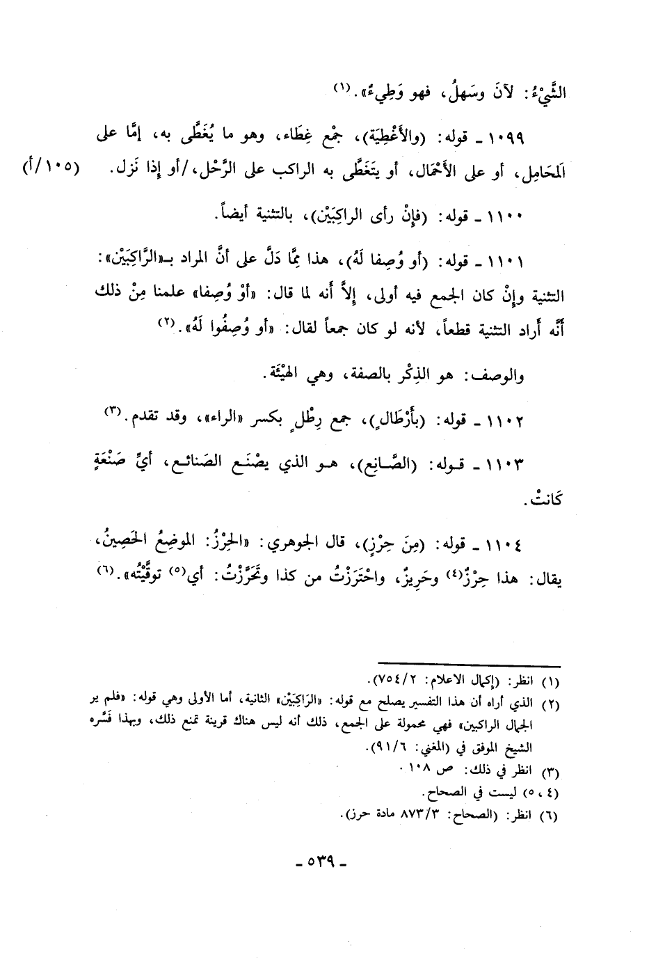 1101 - قوله: (أو وُصِفا لَهُ)، هذا مما دَلَّ على أنَ المراد بـ "الرَّاكِبَين: التثنية وإنْ كان الجمع فيه أولى، إِلَّا أنه لما قال: "أوْ وُصِفا" علمنا مِنْ ذلك انه أراد التثنية قطعًا، لأنه لو كان جمعًا لقال: "أو وُصِفُوا لَهُ". (¬2)