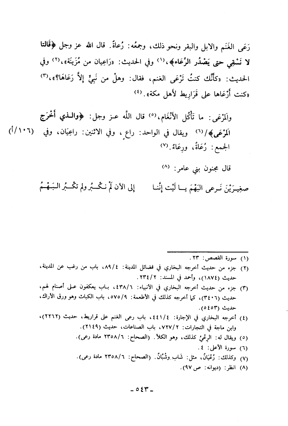 والَمرْعَى: ما تَأكُل الأَنْغَام، (¬5) قال الله عز وجل: {وَالَّذِي أَخْرَجَ الْمَرْعَى} (¬6) ويقال في الواحد: راعٍ، وفي الاثنين: راعِيَان، وفي الجمع: رُعَاةٌ، ورِعَاءٌ. (¬7)
