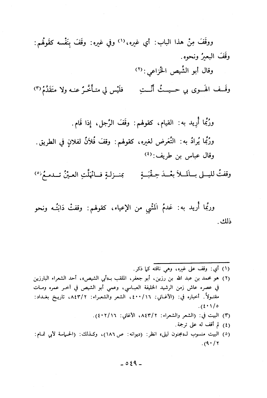 وقَف الهَوى بي حيثُ أنْتِ ... فلَيْس لي متأخَّرٌ عنه ولا متَقَدَّمُ (¬3)