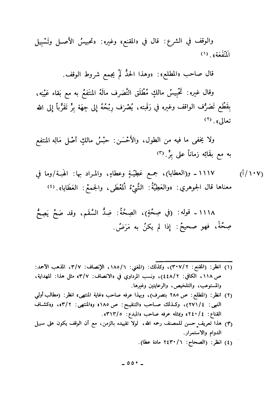 (¬3) هذا تعريف حسن للمصنف رحمه الله، لولا تقييده بالزمن، مع أن الوقف يكون على سبيل الدوام والاستمرار.