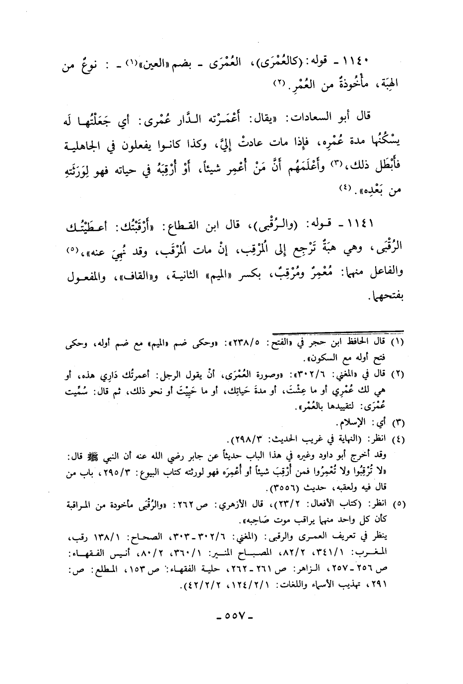 قال أبو السعادات: "يقال: أعْمَرْته الدَّار عُمْرى: أي جَعَلْتُها لَه يسْكُنُها مدة عُمْرِه، فإِذا مات عادتْ إِليَّ، وكذا كانوا يفعلون في الجاهلية فأبْطَل ذلك، (¬3) واعْلَمَهم أنَّ مَنْ أُعْمِر شيئًا، أوْ أرْقِبَهُ في حياته فهو لِوَرَثَتهِ من بَعْدِه". (¬4)