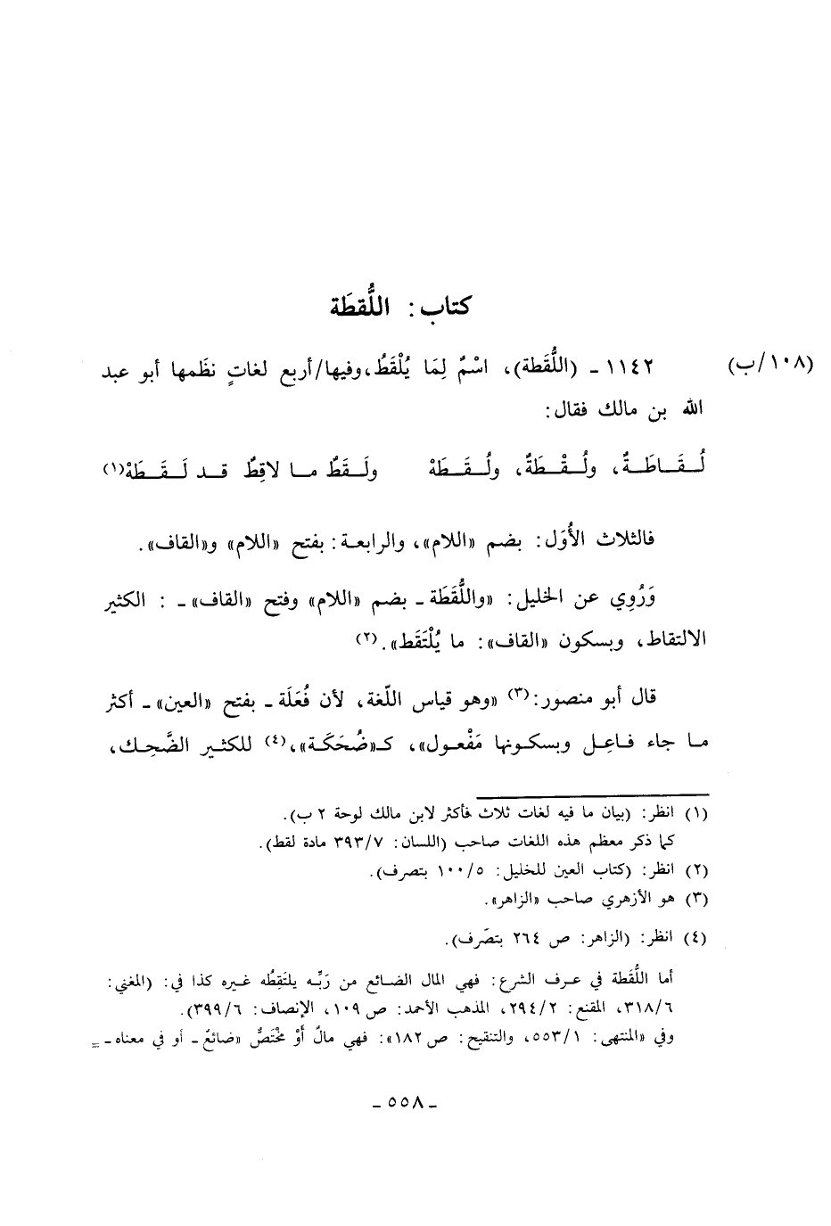 1142 - (اللُّقطة)، اسْمٌ لِمَا يُلْقَطُ، وفيها أربع لغاتٍ نظَمها أبو عبد الله بن مالك فقال:
