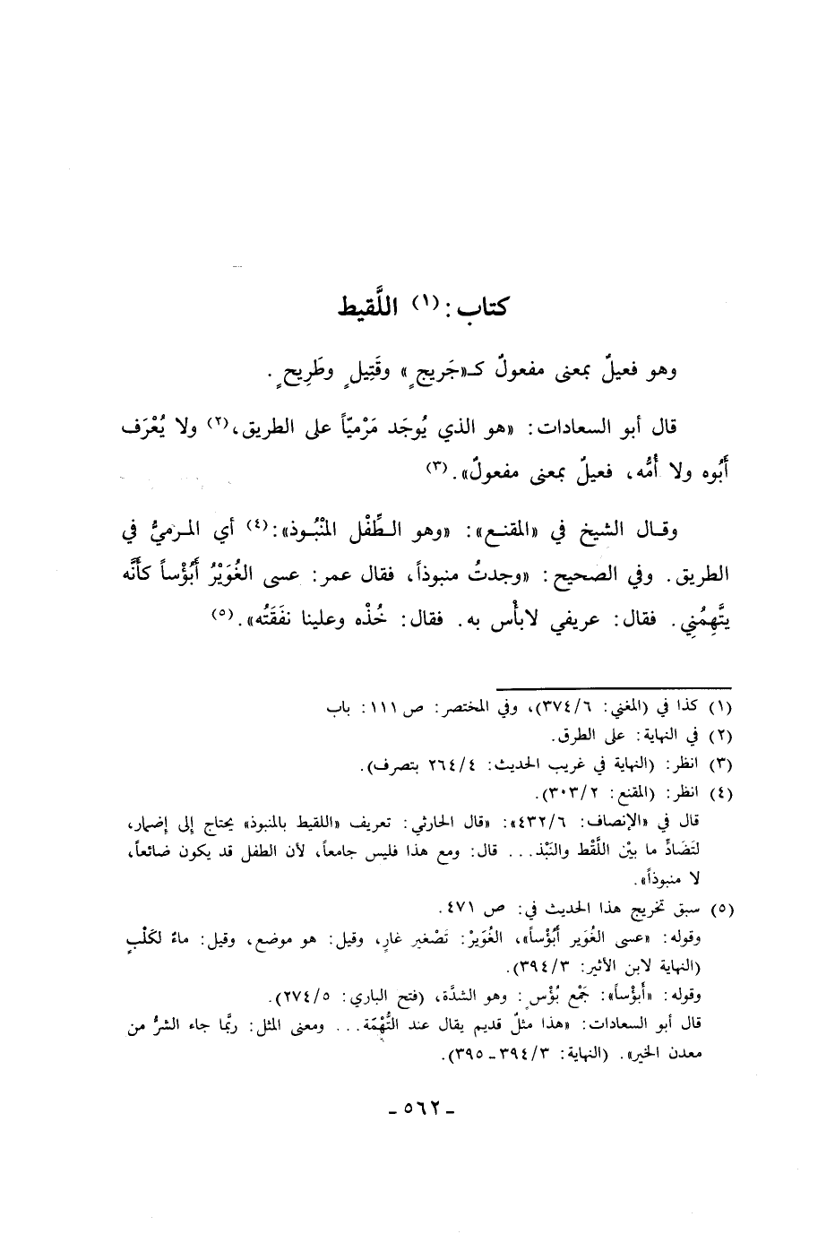 وقال الشيخ في "المقنع": "وهو الطِّفْل المنْبُوذ": (¬4) أي المرميُّ في الطريق. وفي الصحيح: "وجدتُ منبوذًا، فقال عمر: عسى الغُوَيْر أبؤْسًا كأَنَّه يتَّهِمُنِي. فقال: عريفي لا بأس به. فقال: خُذْه وعلينا نفَقَتُه". (¬5)
