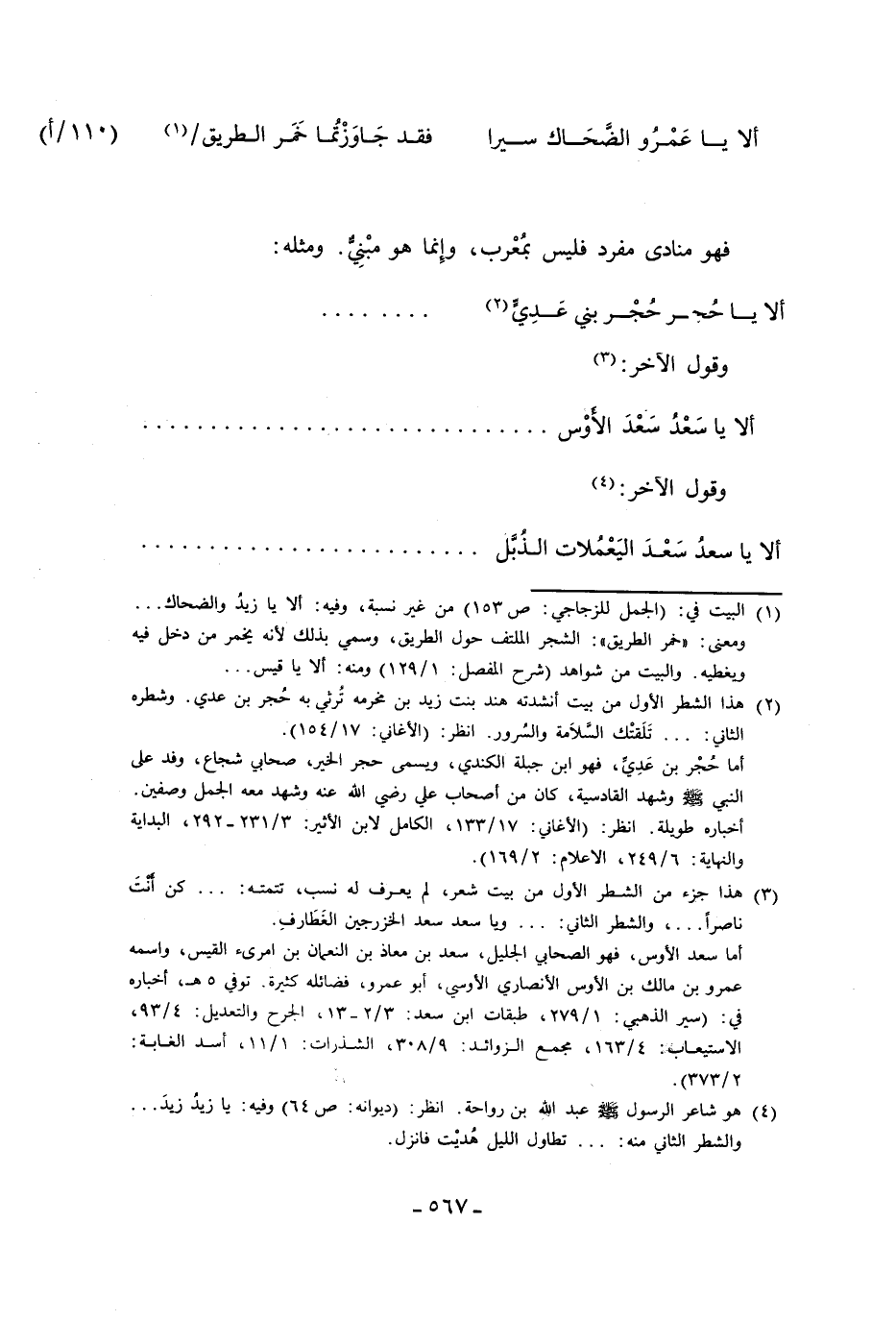 (¬4) هو شاعر الرسول - صلى الله عليه وسلم - عبد الله بن رواحة. انظر: (ديوانه: ص 64) وفيه: يا زيدُ زيدَ ... والشطر الثاني منه: ... تطاول الليل هُديْت فانزل.