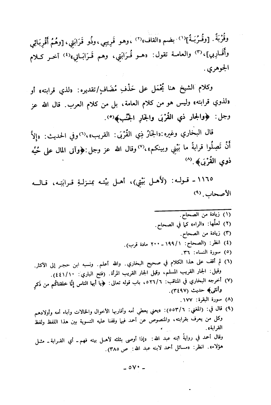 وكلام "الشيخ هنا يُحْمَل على حَذْفِ مُضَافٍ تقديره: الذي قرابته" أو "لذوي قرابته" وليس هو من كلام العامة، بل من كلام العرب. قال الله عز وجل: {وَالْجَارِ ذِي الْقُرْبَى وَالْجَارِ الْجُنُبِ} (¬5).