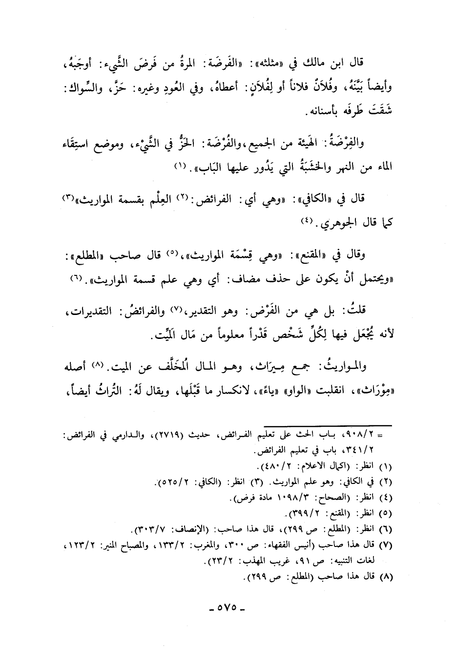 قلتُ: بل هي من الفَرْض: وهو التقدير: (¬7) والفرائضُ: التقديرات، لأنه يُجْعَل فيها لِكُلِّ شَخْص قَدْراً معلوماً من مَال الَميِّت.
