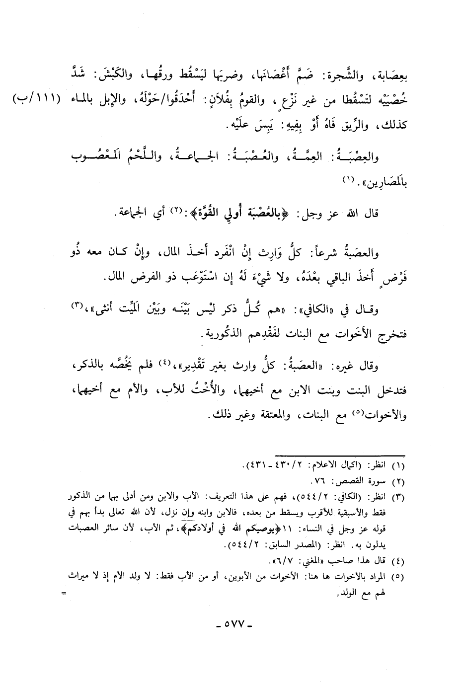 (¬3) انظر: (الكافي: 2/ 544)، فهم على هذا التعريف: الأب والابن ومن أدلى بهما من الذكور فقط والأسبقية للأقرب ويسقط من بعده، فالابن وابنه وإن نزل، لأن الله تعالى بدأ بهم في قوله عز وجل في النساء: 11 {يُوصِيكُمُ اللَّهُ فِي أَوْلَادِكُمْ}، ثم الأب، لأن سائر العصبات يدلون به. انظر: (المصدر السابق: 2/ 544).