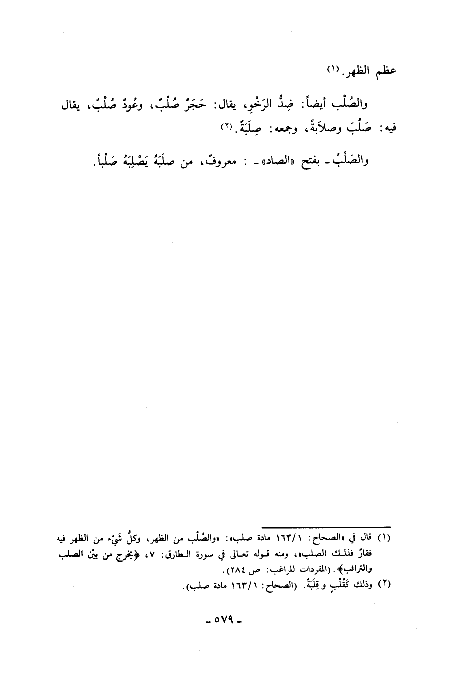 (¬1) قال في "الصحاح: 1/ 163 مادة صلب": "والصُلْب من الظهر، وكلُّ شَيْء من الظهر فيه فقارٌ فذلك الصلب"، ومنه قوله تعالى في سورة الطارق: 7، {يَخْرُجُ مِنْ بَيْنِ الصُّلْبِ وَالتَّرَائِبِ}. (المفردات للراغب: ص 284).
