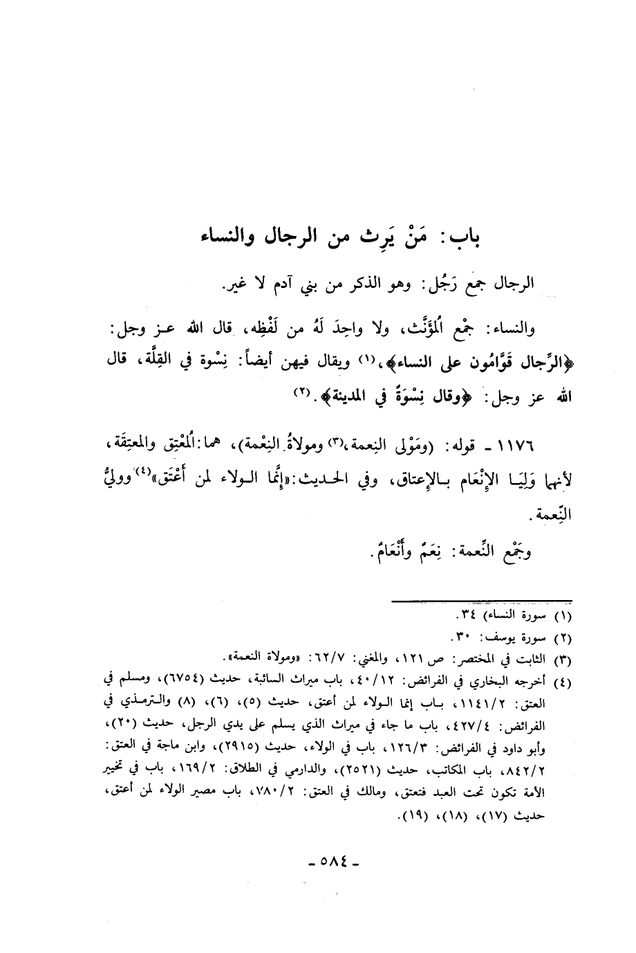 1176 - قوله: (ومَوْلى النِعمة، (¬3) ومولاة النِعْمة)، هما: المُعْتِق والمعتِقَة، لأنهما وَليَا الإِنْعَام بالإِعتاق، وفي الحديث: "إِنَّما الولاء لمن أَعْتَق" (¬4)؛ ووليُّ النِّعمة.