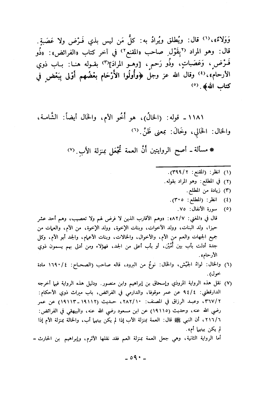 وَوَلاءٌ"، (¬1) قال: وُيطلق ويُرادُ به: كلُّ مَن ليس بذي فَرْض ولا عَصَبةٍ. قال: وهو المراد (بِقَوْلِ صاحب "المقنع) (¬2) في آخر كتاب "الفرائض": "ذُو فَرْضٍ، وَعَصَباتٍ، وذُو رَحم، [وهو المرادَ] (¬3) بقوله هنا: باب ذوي الأرحام"، (¬4) وقال الله عز وجل {وَأُولُو الْأَرْحَامِ بَعْضُهُمْ أَوْلَى بِبَعْضٍ فِي كِتَابِ اللَّهِ}. (¬5)