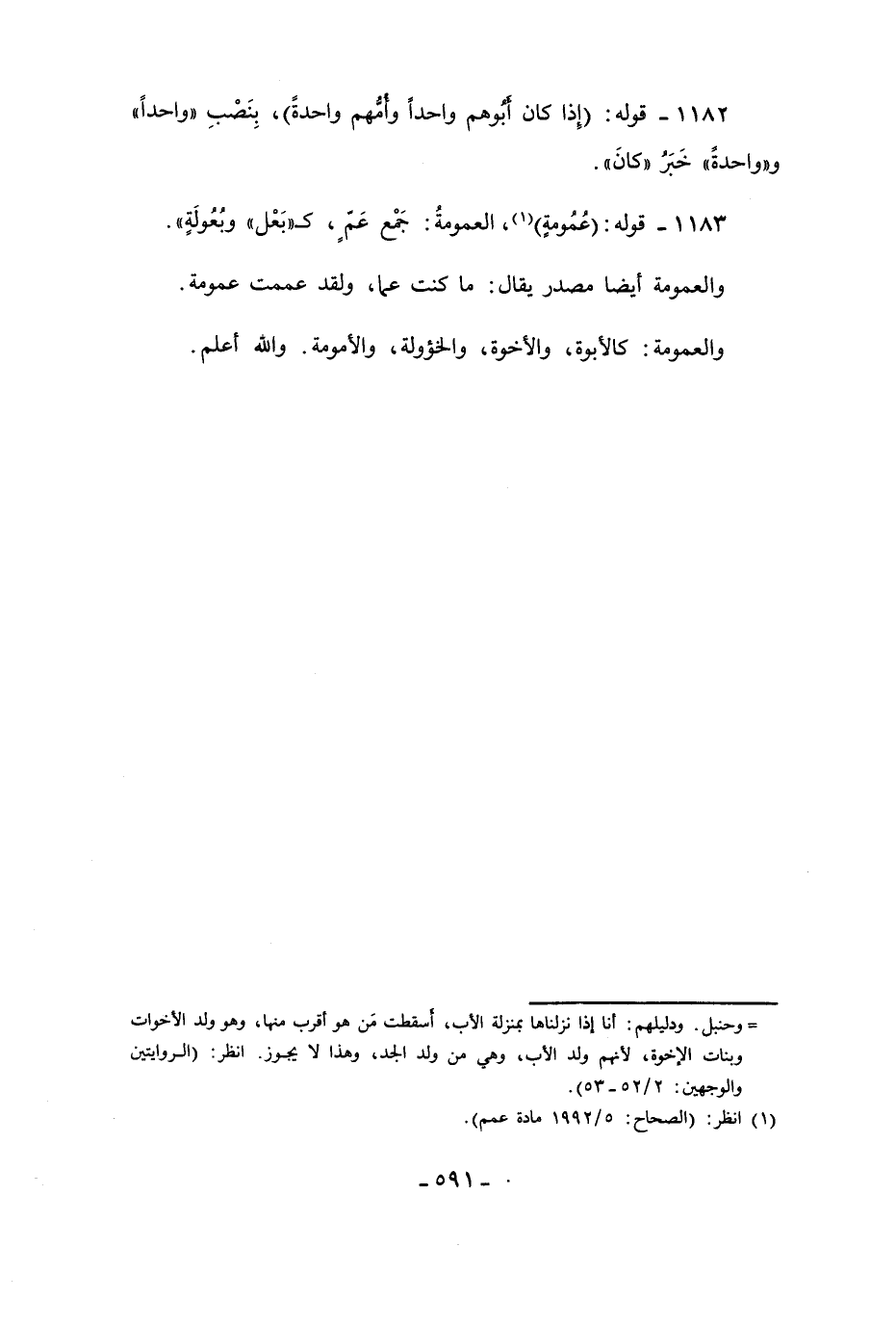1183 - قوله: (عُمُومةٍ) (¬1)، العمومةُ: جَمْع عَمٍّ، كـ "بَعْل" وبُعُولَةٍ".