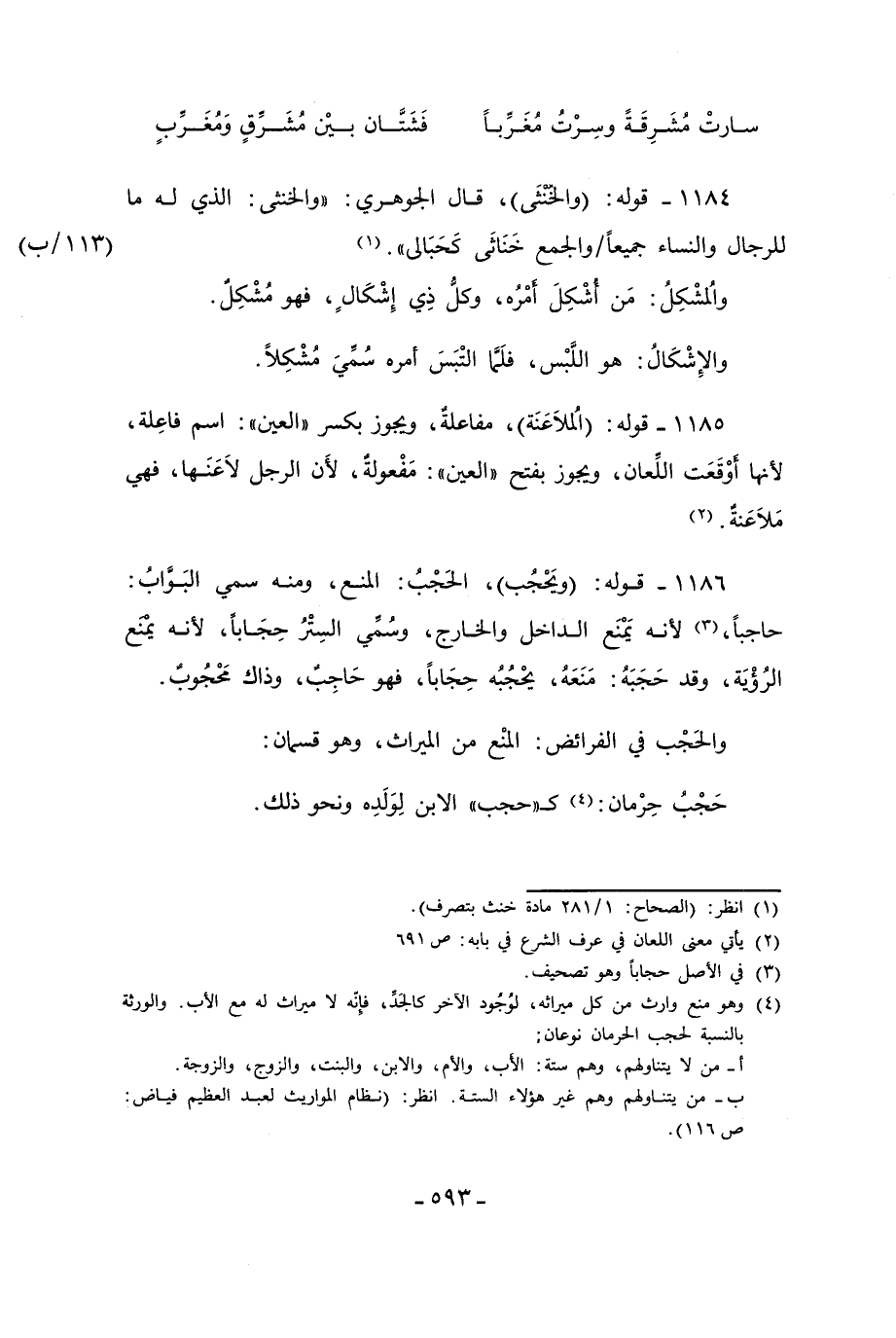 1184 - قوله: (والخُنْثَى)، قال الجوهري: "والخنثى: الذي له ما للرجال والنساء جميعاً والجمع خَنَاثَى كَحَبَالى". (¬1)