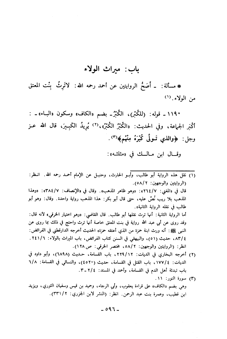 * مسألة: - أَصَحُّ الروايتين عن أحمد رحمه الله: لا تَرِثُ بِنْت المعتق من الولاء. (¬1)