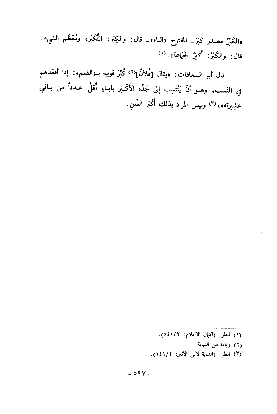 قال أبو السعادات: "يقال [فُلاَنٌ] (¬2) كُبْرُ قومِه بـ"الضم": إِذا أقعَدهم في النَسب، وهو أنْ يَنْتَسِب إِلى جَدِّه الأَكْبَر بآباءٍ أَقلَّ عدداً من باقي عَشِيرته"، (¬3) وليس المراد بذلك أَكْبَر السِّنِ.